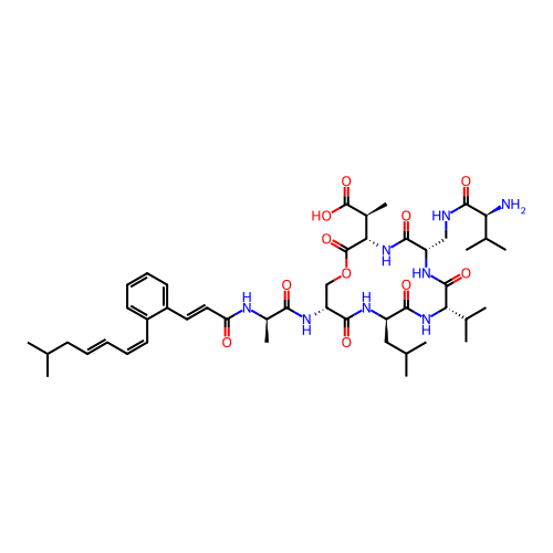 | SMILES | CC(C)C/C=C/C=C\C1=CC=CC=C1/C=C/C(=O)N[C@H](C)C(=O)N[C@@H]1COC(=O)[C@H]([C@H](C)C(=O)O)NC(=O)[C@H](CNC(=O)[C@@H](N)C(C)C)NC(=O)[C@H](C(C)C)NC(=O)[C@@H](CC(C)C)NC1=O |