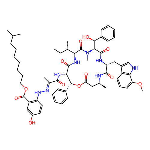 | SMILES | CC[C@H](C)[C@@H]1NC(=O)[C@@H](NC(=O)C(C)=NNC2=C(C(=O)OCCCCCCCC(C)C)C=C(O)C=C2)[C@@H](C2=CC=CC=C2)OC(=O)C[C@H](C)NC(=O)[C@@H](CC2=C[NH]C3=C2C=CC=C3OC)NC(=O)[C@H]([C@@H](O)C2=CC=CC=C2)N(C)C1=O |