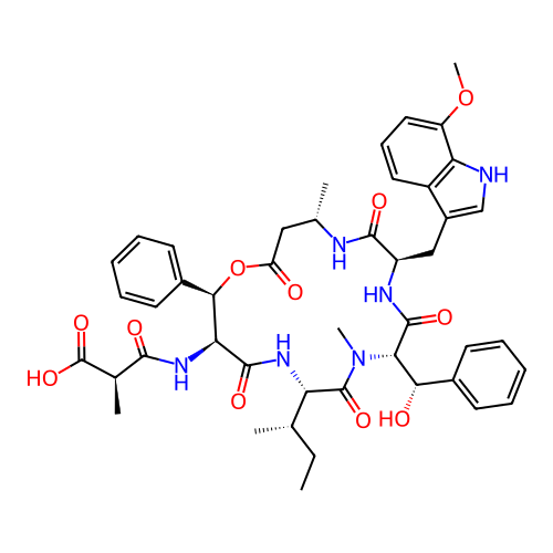 | SMILES | CC[C@H](C)[C@@H]1NC(=O)[C@@H](NC(=O)[C@@H](C)C(=O)O)[C@@H](C2=CC=CC=C2)OC(=O)C[C@H](C)NC(=O)[C@@H](CC2=C[NH]C3=C2C=CC=C3OC)NC(=O)[C@H]([C@@H](O)C2=CC=CC=C2)N(C)C1=O |