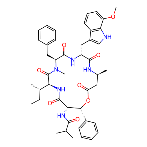 | SMILES | CC[C@H](C)[C@@H]1NC(=O)[C@@H](NC(=O)C(C)C)[C@@H](C2=CC=CC=C2)OC(=O)C[C@H](C)NC(=O)[C@@H](CC2=C[NH]C3=C2C=CC=C3OC)NC(=O)[C@H](CC2=CC=CC=C2)N(C)C1=O |