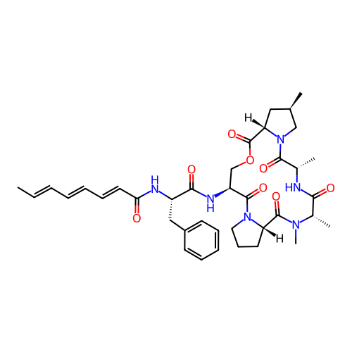 | SMILES | C/C=C/C=C/C=C/C(=O)N[C@@H](CC1=CC=CC=C1)C(=O)N[C@H]1COC(=O)[C@@H]2C[C@@H](C)CN2C(=O)[C@H](C)NC(=O)[C@H](C)N(C)C(=O)[C@@H]2CCCN2C1=O |