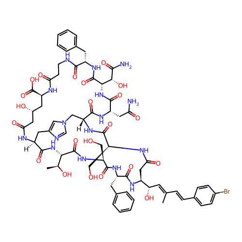 | SMILES | CC(/C=C/C1=CC=C(Br)C=C1)=C\[C@H](O)[C@@H]1CC(=O)N[C@@H](CO)C(=O)N[C@@H]2CN3C=NC(=C3)C[C@H](NC(=O)C[C@H](O)C[C@@H](C(=O)O)NC(=O)CCNC(=O)[C@H](CC3=CC=CC=C3)NC(=O)[C@H]([C@@H](O)C(N)=O)NC(=O)[C@H](CC(N)=O)NC2=O)C(=O)N[C@@H]([C@H](C)O)C(=O)N[C@@H](CO)C(=O)N[C@@H](CC2=CC=CC=C2)C(=O)N1 |