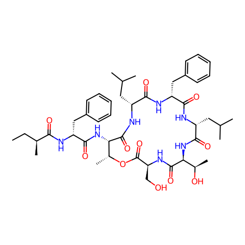 | SMILES | CC[C@H](C)C(=O)N[C@H](CC1=CC=CC=C1)C(=O)N[C@@H]1C(=O)N[C@H](CC(C)C)C(=O)N[C@H](CC2=CC=CC=C2)C(=O)N[C@H](CC(C)C)C(=O)N[C@@H]([C@@H](C)O)C(=O)N[C@@H](CO)C(=O)O[C@@H]1C |