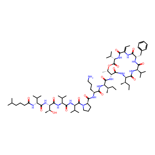 | SMILES | C/C=C1\NC(=O)[C@H](CC2=CC=CC=C2)NC(=O)[C@@H](C(C)C)NC(=O)[C@@H]([C@H](C)CC)NC(=O)[C@H](NC(=O)[C@H](NC(=O)[C@H](CCCN)NC(=O)[C@H]2CCCN2C(=O)[C@H](NC(=O)[C@@H](NC(=O)[C@@H](NC(=O)[C@H](NC(=O)CCCC(C)C)C(C)C)[C@H](C)O)C(C)C)C(C)C)[C@H](C)CC)[C@H](C)OC(=O)[C@H](C(C)C)NC1=O |