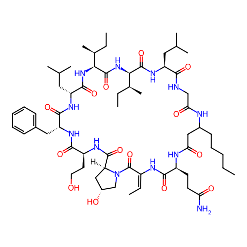 | SMILES | CC=C1NC(=O)[C@H](CCC(N)=O)NC(=O)CC(CCCCC)NC(=O)CNC(=O)[C@H](CC(C)C)NC(=O)[C@@H]([C@@H](C)CC)NC(=O)[C@H]([C@@H](C)CC)NC(=O)[C@@H](CC(C)C)NC(=O)[C@@H](CC2=CC=CC=C2)NC(=O)[C@H](CCO)NC(=O)[C@@H]2C[C@@H](O)CN2C1=O |
