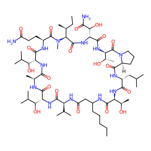| SMILES | CCCCCC1CC(=O)N[C@@H](C(C)C)C(=O)N[C@H](C(O)C(C)C)C(=O)N[C@@H](C)C(=O)N[C@H](C(O)C(C)C)C(=O)N[C@@H](CCC(N)=O)C(=O)N(C)[C@@H]([C@@H](C)CC)C(=O)N[C@H](C(O)C(N)=O)C(=O)N[C@H]([C@H](C)O)C(=O)N2CCC[C@H]2C(=O)N[C@H](CC(C)C)C(=O)N[C@@H]([C@@H](C)O)C(=O)N1 |