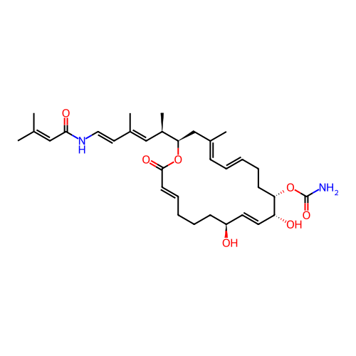 | InChI | InChI=1S/C33H48N2O7/c1-23(2)20-31(38)35-19-18-25(4)21-26(5)30-22-24(3)12-8-6-10-14-29(42-33(34)40)28(37)17-16-27(36)13-9-7-11-15-32(39)41-30/h6,8,11-12,15-21,26-30,36-37H,7,9-10,13-14,22H2,1-5H3,(H2,34,40)(H,35,38)/b8-6+,15-11?,17-16+,19-18+,24-12+,25-21+/t26-,27+,28-,29+,30-/m1/s1 |