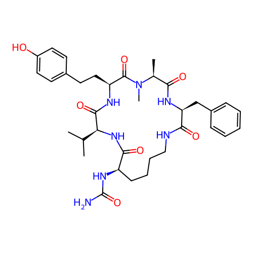 | SMILES | CC(C)[C@@H]1NC(=O)[C@H](NC(N)=O)CCCCNC(=O)[C@H](CC2=CC=CC=C2)NC(=O)[C@H](C)N(C)C(=O)[C@H](CCC2=CC=C(O)C=C2)NC1=O |