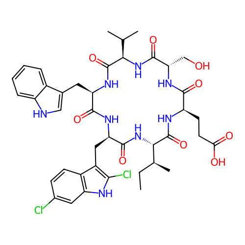 | SMILES | CC[C@H](C)[C@@H]1NC(=O)[C@@H](CC2=C(Cl)[NH]C3=C2C=CC(Cl)=C3)NC(=O)[C@@H](CC2=C[NH]C3=CC=CC=C23)NC(=O)[C@@H](C(C)C)NC(=O)[C@H](CO)NC(=O)[C@@H](CCC(=O)O)NC1=O |