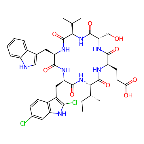 SMILES | CC[C@@H](C)[C@@H]1NC(=O)[C@@H](CC2=C(Cl)[NH]C3=C2C=CC(Cl)=C3)NC(=O)[C@@H](CC2=C[NH]C3=CC=CC=C23)NC(=O)[C@@H](C(C)C)NC(=O)[C@H](CO)NC(=O)[C@@H](CCC(=O)O)NC1=O |