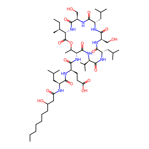 | SMILES | CCCCCCCC(CC(=O)N[C@@H](CC(C)C)C(=O)N[C@H](CCC(=O)O)C(=O)N[C@@H]1C(OC(=O)[C@@H](NC(=O)[C@H](NC(=O)[C@@H](NC(=O)[C@H](NC(=O)[C@@H](NC(=O)[C@H](NC1=O)C(C)C)CC(C)C)CO)CC(C)C)CO)[C@@H](C)CC)C)O |