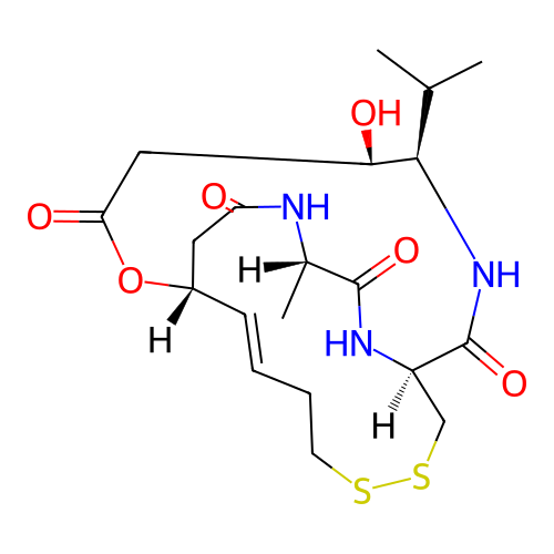 | SMILES | CC(C)[C@H]1NC(=O)[C@H]2CSSCC/C=C/[C@@H](CC(=O)N[C@@H](C)C(=O)N2)OC(=O)C[C@@H]1O |