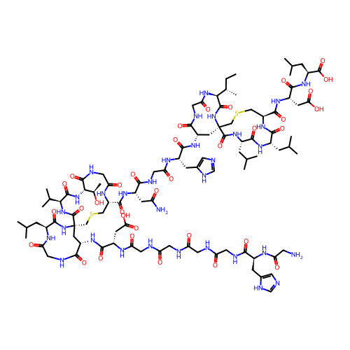 InChI=1S/C99H152N32O34S2/c1-14-48(12)78-94(161)131-98(39-167-38-64(90(157)121-59(23-76(145)146)88(155)122-60(95(162)163)18-46(8)9)125-84(151)52(15-43(2)3)119-85(152)53(16-44(4)5)126-96(98)164)24-61(83(150)110-36-74(142)127-78)123-86(153)56(20-51-28-103-42-113-51)116-72(140)33-108-81(148)57(21-65(101)133)120-89(156)63-37-166-40-99(97(165)129-77(47(10)11)93(160)128-79(49(13)132)92(159)111-35-73(141)118-63)25-62(82(149)109-34-71(139)115-54(17-45(6)7)91(158)130-99)124-87(154)58(22-75(143)144)117-70(138)32-106-68(136)30-104-67(135)29-105-69(137)31-107-80(147)55(114-66(134)26-100)19-50-27-102-41-112-50/h27-28,41-49,52-64,77-79,132H,14-26,29-40,100H2,1-13H3,(H2,101,133)(H,102,112)(H,103,113)(H,104,135)(H,105,137)(H,106,136)(H,107,147)(H,108,148)(H,109,149)(H,110,150)(H,111,159)(H,114,134)(H,115,139)(H,116,140)(H,117,138)(H,118,141)(H,119,152)(H,120,156)(H,121,157)(H,122,155)(H,123,153)(H,124,154)(H,125,151)(H,126,164)(H,127,142)(H,128,160)(H,129,165)(H,130,158)(H,131,161)(H,143,144)(H,145,146)(H,162,163)/t48-,49+,52-,53-,54-,55-,56-,57-,58-,59-,60-,61-,62-,63-,64-,77-,78-,79-,98-,99-/m0/s1 |
