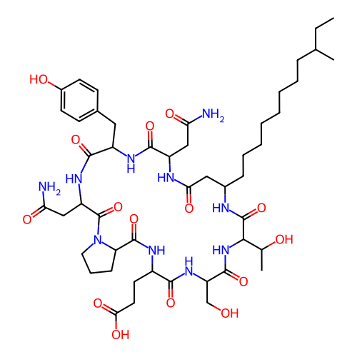 | SMILES | CCC(C)CCCCCCCCC1CC(=O)NC(C(=O)NC(C(=O)NC(C(=O)N2CCCC2C(=O)NC(C(=O)NC(C(=O)NC(C(=O)N1)C(C)O)CO)CCC(=O)O)CC(=O)N)CC3=CC=C(C=C3)O)CC(=O)N |