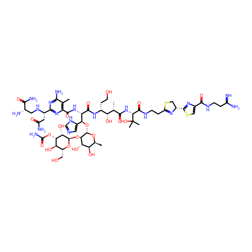 | SMILES | C[C@H]1[C@H]([C@@H]([C@@H]([C@@H](O1)O[C@@H](C2=CN=CN2)[C@@H](C(=O)N[C@H](CCO)[C@H]([C@H](C)C(=O)N[C@H](C(=O)NCCC3=N[C@H](CS3)C4=NC(=CS4)C(=O)NCCC(=N)N)C(C)(C)O)O)NC(=O)C5=C(C(=NC(=N5)[C@H](CC(=O)N)NC[C@@H](C(=O)N)N)N)C)O[C@@H]6[C@H]([C@H]([C@@H]([C@H](O6)CO)O)OC(=O)N)O)O)O |