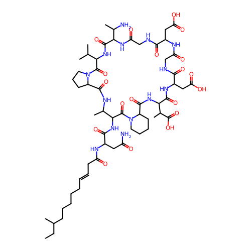 | SMILES | CCC(C)CCCCC/C=C/CC(=O)NC(CC(=O)N)C(=O)NC1C(NC(=O)C2CCCN2C(=O)C(NC(=O)C(NC(=O)CNC(=O)C(NC(=O)CNC(=O)C(NC(=O)C(NC(=O)C3CCCCN3C1=O)C(C)C(=O)O)CC(=O)O)CC(=O)O)C(C)N)C(C)C)C |